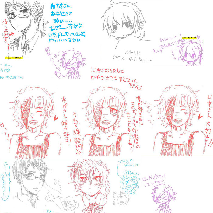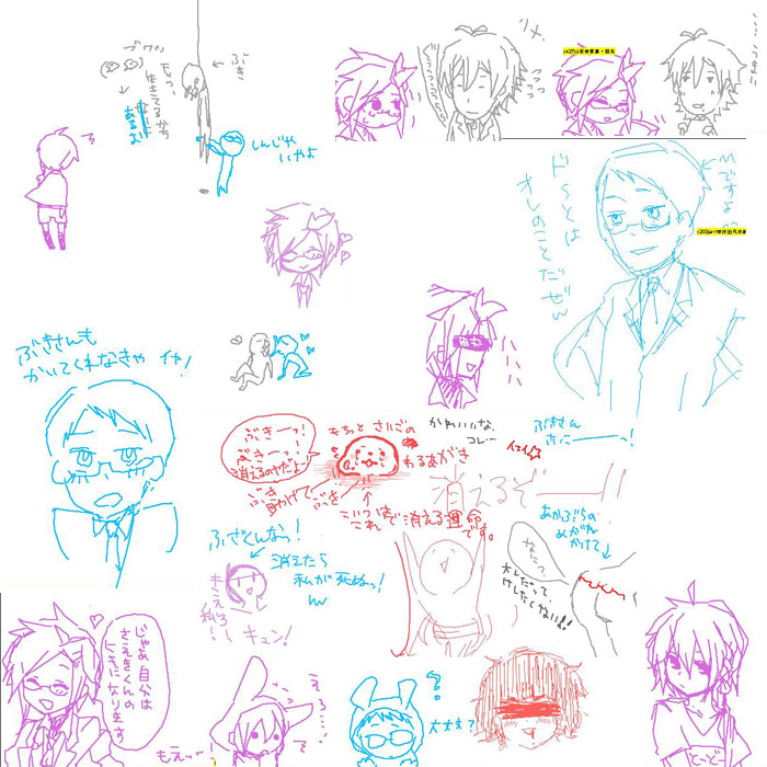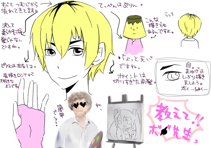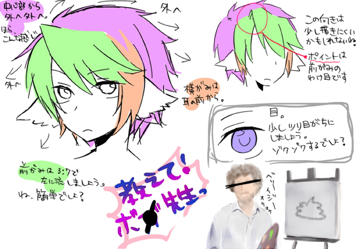 以下SNSのコピペ 鷹夜さん、ゆっち、どS正宗さんから頂きました! 洋と一久の描き方! ボブが頑張ってくれました。 【お子さんの描き方教えてくださいバトン】 ・指定されたキャラの描き方、描く上でのポイントを説明してください、というバトンです。 ・絵だけでも文章だけでも結構です。 ・最後に、描き方を知りたいキャラ5人くらいにバトンを回してください。(アンカー可) ポイントを少しまとめてみました。 茲出一久 ・髪型(画像参照) ・目つき悪い ・結構なで肩 ・ファッション⇒ダサい(制服かジャージが主) ・身長も低すぎないし痩せ型でもありません 真近洋 ・髪型(画像参照) ・染めっぱなしで天辺がプリン状態 ・眉はしっかりカットしてるよ!真っ黒だけど ・それなりにおしゃれさん(主にセンスがないだけ!) ・いっつも笑ってる 私が皆さんに教えるのはテクニックだけです。 キャンバスの中で貴方は王様です、あなたが絶対なんです。 絵に失敗なんてないんです。 大胆に、豪快に、もっと貴方らしく描いていきましょう。 ね、簡単でしょう? 次の犠牲者 やち(ん)こ宅の御堂葉琉君 猪木さん宅の陽野優希君 いっちゃん宅の笹尾ちかの君 カナ太宅の花鳥雛君 timoさん宅の宗田 松彦君 皆にバトンパス成功済み!いえい! 以下コメント返しです! 2009.02.22 Sun 00:03:14 スカイプってさ…スカイプっておもしろいの?